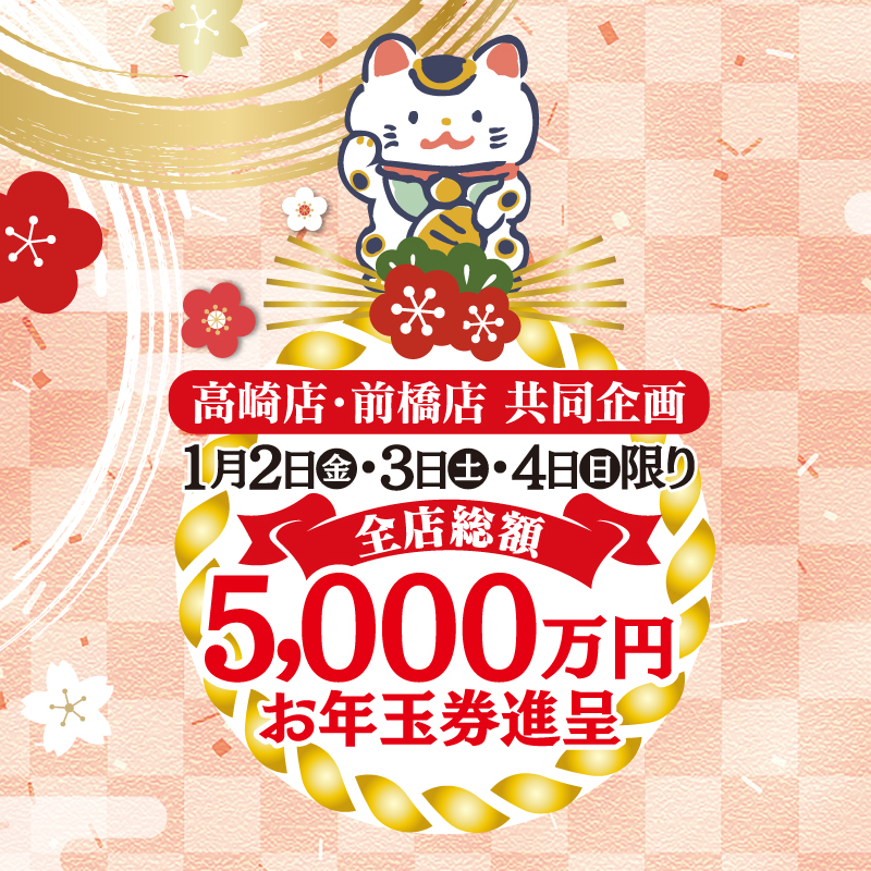 ■2026年1月2日(金)・3日(土)・4日(日)限り 全店総額5,000万円お年玉券進呈!! 一売場で、税抜3,000円以上(レシート単位)のお買上げ金額に応じて進呈いたします。 「お年玉券」のご利用は1月2日(金)・3日(土)・4日(日)限りです。 ※一部除外品がございます。 ※福袋のお買い上げ、「ポイントお買物券」「お年玉券」によるお買物には進呈いたしません。 ※おつり銭は出ません。
