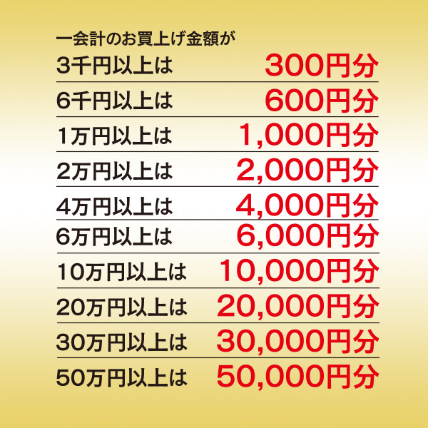 ※一部除外品がございます。 ※次のものについてはお年玉券を進呈いたしません。 (福袋/2階 フルーツパーラーサンエイ/ボンジョルノ/ 商品券/各種ギフト券/配送料/修理代工賃/鞘町ビル地下1階 クリニカルエステ花蔵 他) ※次のものについてはお年玉券でのお買物はできません。 (福袋/商品券/各種ギフト券/配送料/修理代工賃/鞘町ビル地下1階 クリニカルエステ花蔵 他) ※1月2日(金)・3日(土)・4日(日)は、お年玉進呈につき スズランカードポイントは適応除外となります。(HABAを除く) 但し、年間お買い上げ額には加算されます。