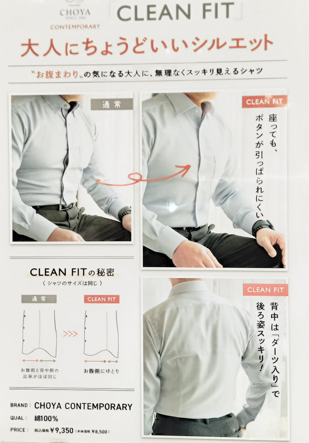 通常ワイシャツの型紙は、お腹側と背中側の生地の幅がほぼ均等に作られています。 クリーンフィットシャツの型紙は、同じ寸法でお腹周りに余裕を持たせ 背中はスッキリとしたスタイルで「無理なくスッキリ」を実現しました。 ”お腹まわり”の気になる大人の方、 「無理なくスッキリ見えるシャツ」をぜひお試しください。 ワイシャツ サイズ ネック:38~43 綿100% イージーケア 税込9,350円
